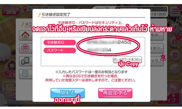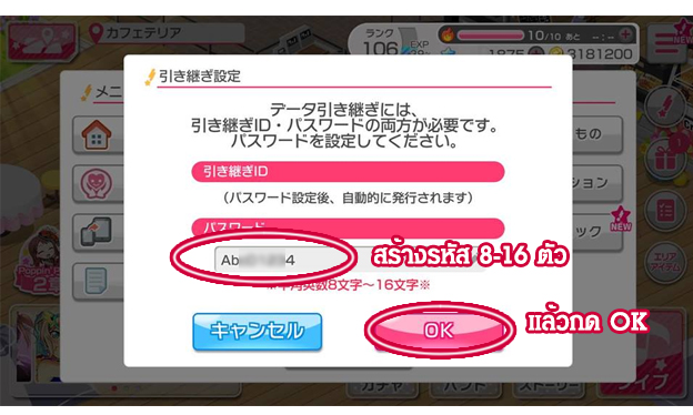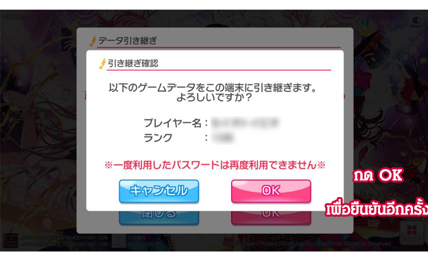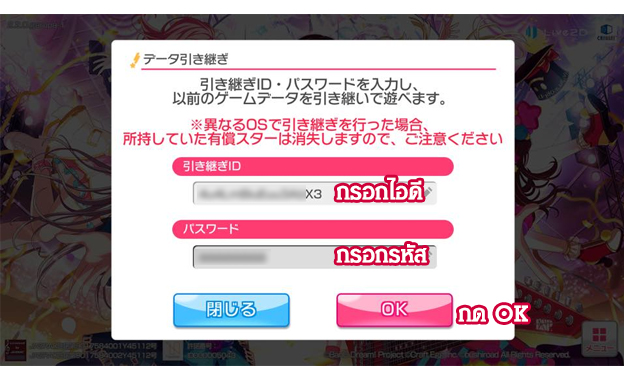 2. กดปุ่ม テータ引き継ぎ แล้วกรอกไอดี และ รหัส ที่ได้มาใหม่ลงในช่องแล้วกดปุ่มขวามือ