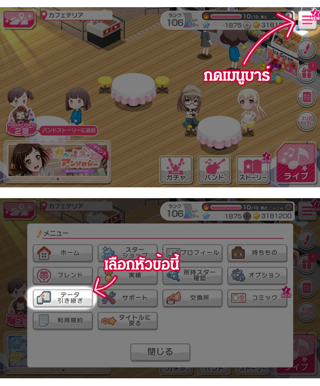 เมื่ออยู่ในเกม กดเมนูบาร์ด้านขวาบน เลือกที่หัวข้อ テータ引き継ぎ (ดังภาพ)